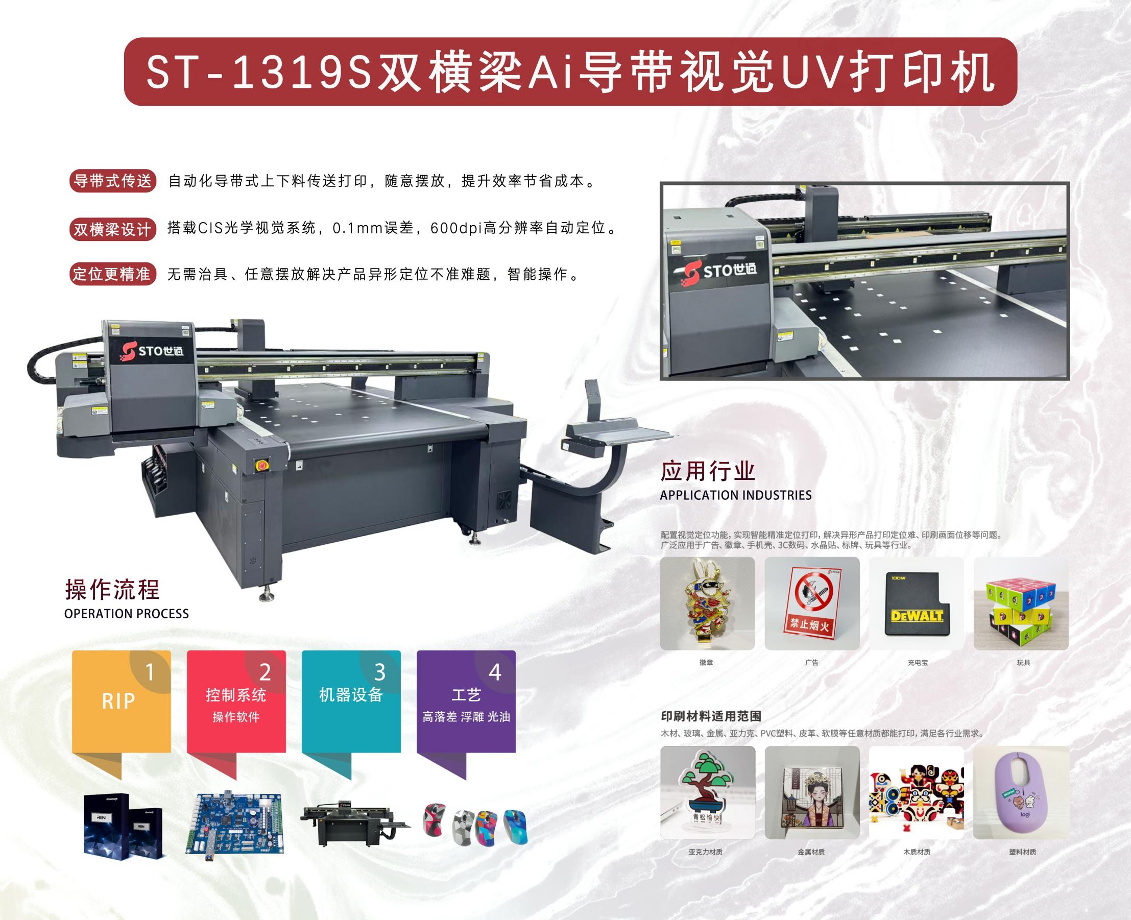 世通智能主要生產(chǎn)UV平板打印機(jī)、視覺定位UV打印機(jī)、導(dǎo)帶式UV打印機(jī),自主研發(fā)生產(chǎn),進(jìn)全鋼一體機(jī)架,機(jī)器支持加高定制,磁懸浮打印速度快,精準(zhǔn)高效,搭載理光G6噴頭可打印高落差物品,可打印1-35MM落差。UV打印無須制版,電腦出圖一體印刷成形,方便快捷,廣泛應(yīng)用于各類發(fā)夾飾品、玩具彩印、金屬徽章、電器面板、皮革箱包、手機(jī)殼、廣告標(biāo)識標(biāo)牌、建材裝飾、瓷磚背景墻、木板藝術(shù)畫、玻璃材質(zhì)、金屬材質(zhì)、塑料材質(zhì)選等平面材料都可以印刷,世通智能是UV平板打印機(jī)專業(yè)制造廠家,價格低,速度快精度高,免費(fèi)打樣,售后上門維修服務(wù),免費(fèi)安裝調(diào)試等。